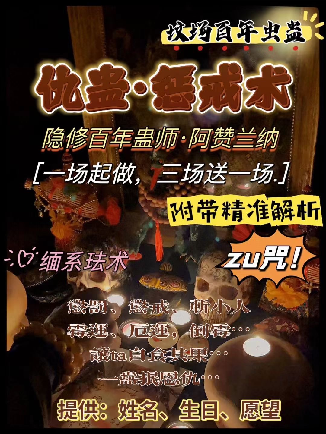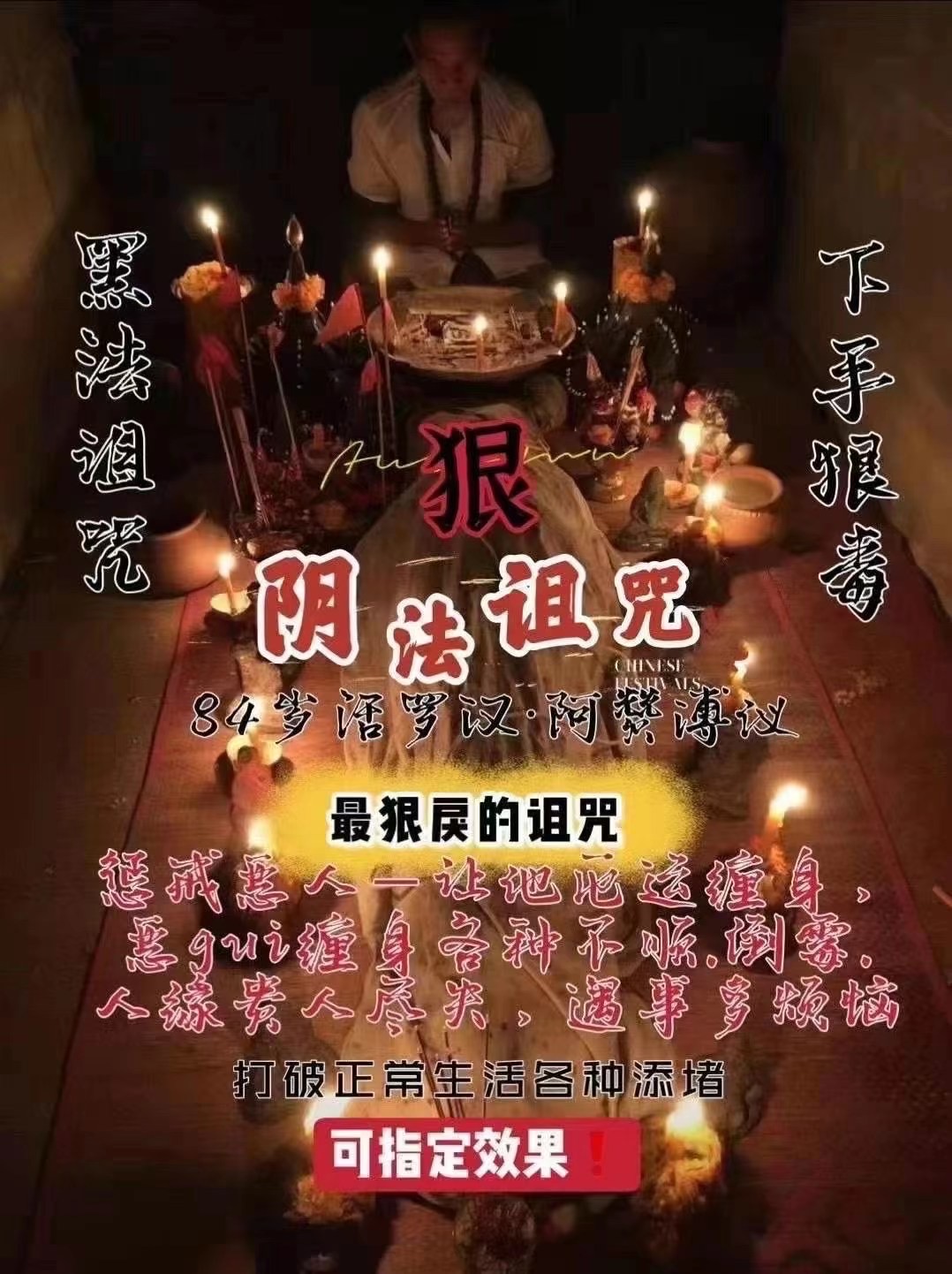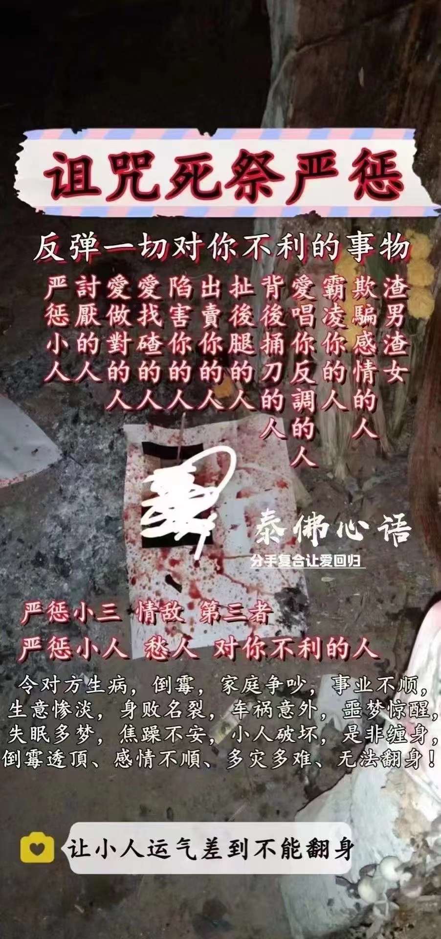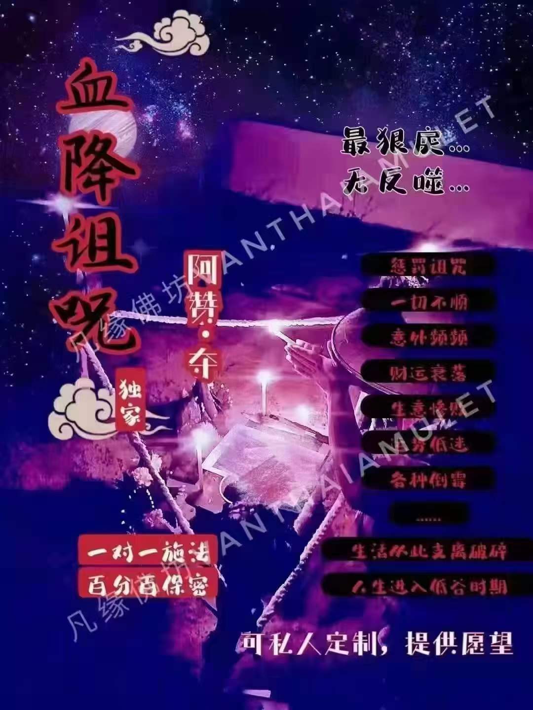 阿赞福高端定制诅咒提供☝️姓名日期照片即可🚬诅指咒定下降🦠黑诅法咒,狠戾最的诅咒💀惩恶人戒,让他运厄缠身,恶gui缠身👻,各种不顺,各种倒霉☠人贵缘尽人失,财,破各种不,顺各烦种恼,打破正常生活各,种添堵…指定效果 让小,人三小倒霉疾病不断🦠不动心再思别害小人人作祟🦠恶意陷害🦠受人排挤 🦠领导压迫...