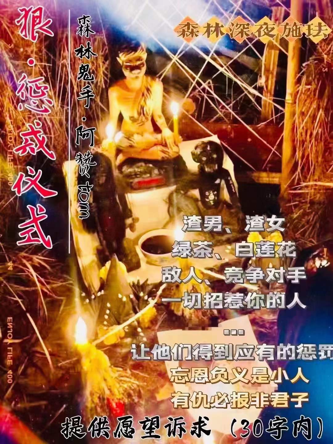 🌈鲁士龙山林皮烹诅咒法事。 仇人,人敌,竞争对,手令对方病生,倒霉,小人多增,家争庭吵 ,生意惨,败财运衰败,势运低落,活生各种不顺。此邪将罚惩小三二奶、介感入情的第三者不。论男女、对于种这人做此头将不会承任受何因果、让其自食其果。提供材料:...