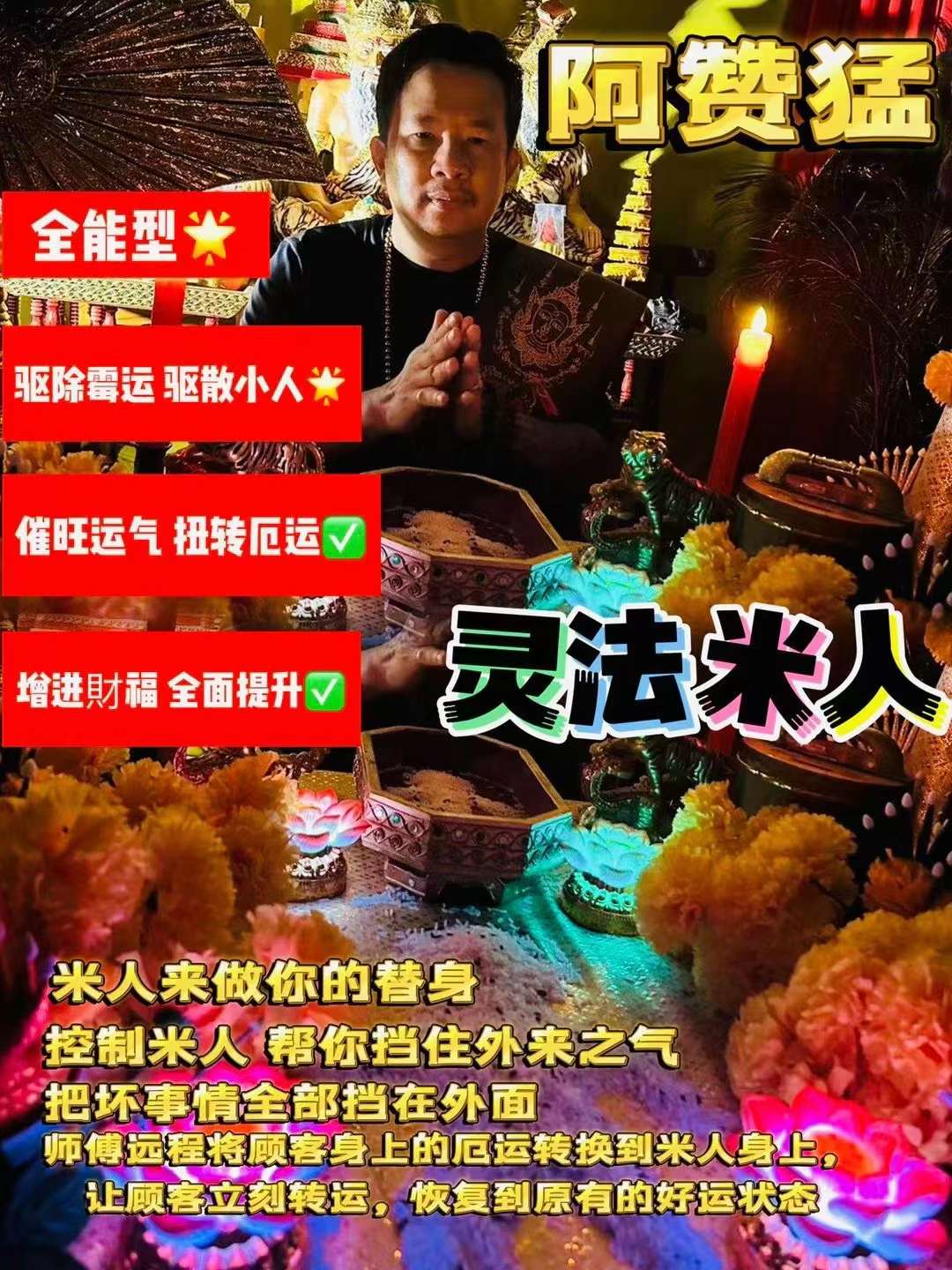 阿赞猛特别猛🆕阿赞猛灵法米人系列属于全能型,功效型仪式去除霉运,驱散小人,催旺运气,扭转厄运🏻阿赞猛师傅通过此做法事,向诸神佛诸祈祷远,程将善信身上霉的运化解米到人身上即,可让善信运转,恢复到原有的好状运态。顾客需要提供自己的生日,姓名,照片,另外特别注意⚠️,需要...