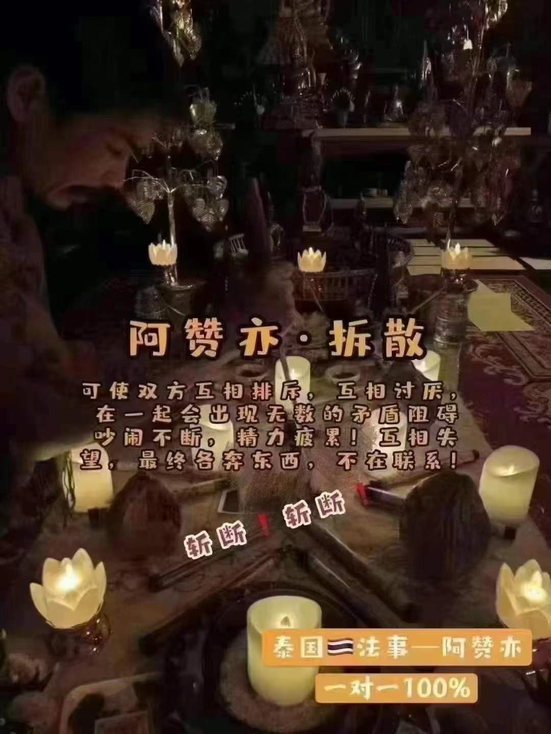 【阿🇹🇭拆散法事】拆散术主要适用欲求分手,或对方纠缠不休、感情确实破裂且不愿挽回的情况,使事主尽早解脱不应该有的感情和婚姻。作用是让男女见面如羊见虎伤逃。 拆散法事,就是斩断这跟线,改变各自的想法。起效后可使双方互相排斥,互相讨厌,在一起会出现无数的矛盾阻碍 吵闹不断,精力疲累!互相失望,最终各奔...