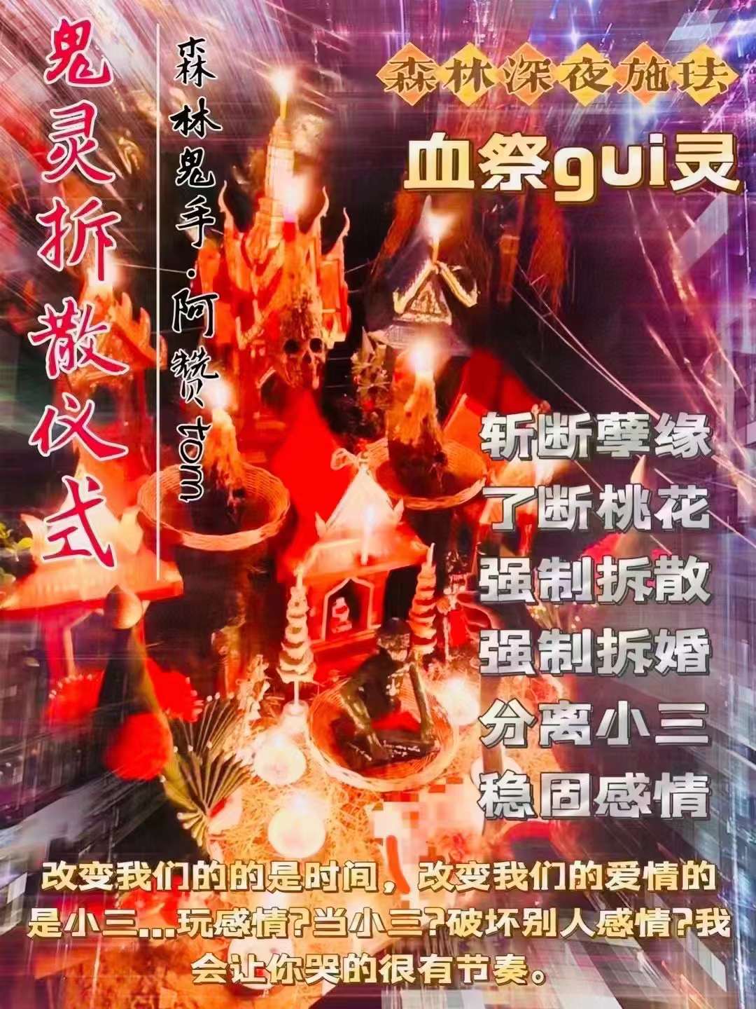 【鲁士龙🇹🇭山林皮烹拆散法事】拆散术主要适用欲求分手,或对方纠缠不休、感情确实破裂且不愿挽回的情况,使事主尽早解脱不应该有的感情和婚姻。作用是让男女见面如羊见虎伤逃。 拆散法事,就是斩断这跟线,改变各自的想法。起效后可使双方互相排斥,互相讨厌,在一起会出现无数的矛盾阻碍 吵闹不断,精力疲累!互相失望...