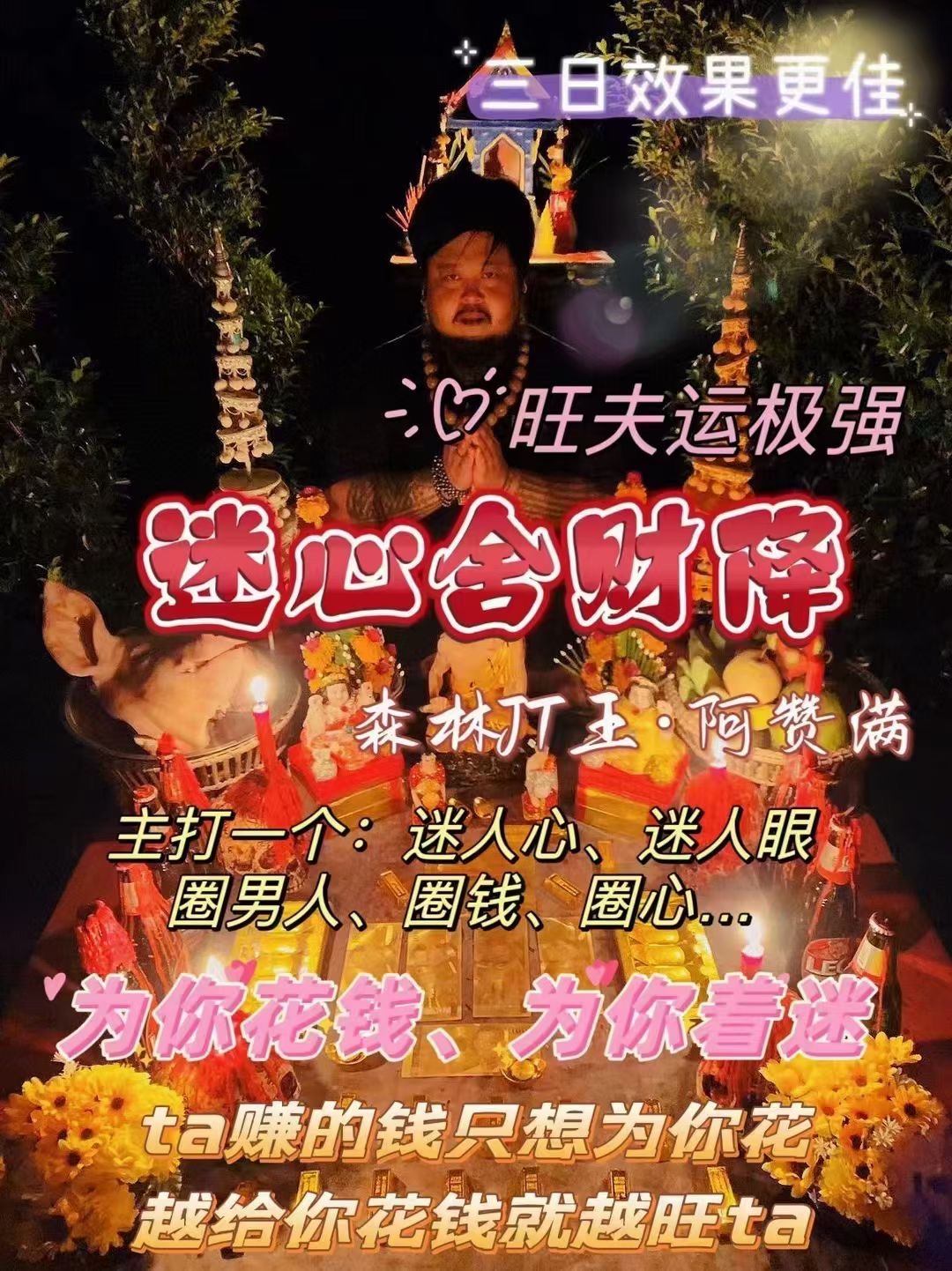 ✨【森林JT王阿赞满•迷心舍财J🔥】主打一个:迷人心、迷人眼、圈男人、圈钱、圈心...让你的男人爱不释手、让你的男人围着你转、让你的男神为你颠倒、顶级舍财法门‼️让他为你花钱、为你着迷‼️此FS不仅可以帮你成功拴住男人的心,而且可以帮你的男人得到事业各方面的提升,旺夫运极强‼️他赚的 只想为你花,...