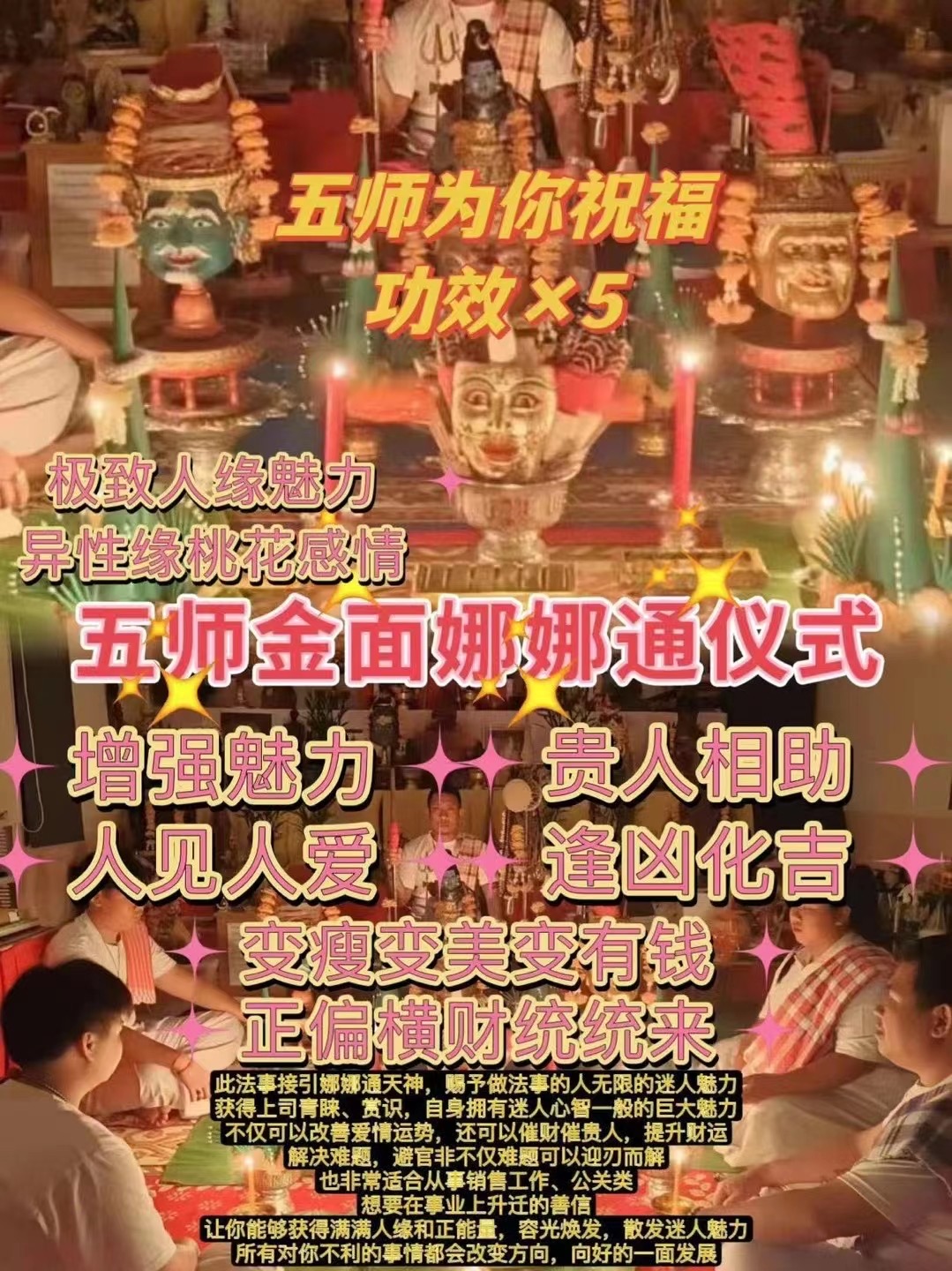 五师强强联合古法金面娜娜通法事🤙推荐 指数⭐⭐⭐⭐⭐⚠️极致人缘魅力招财术‼️此法事会让你人见人爱,花见花开,提升你的魅力,让见到你的人就想无条件喜欢你,听你说话,愿意为你做一切你想做的事。会让你的敌对投降,敌人会变成朋友,不好的事物远离,谁有对你不利的想法想陷害你都会失败。金面娜娜通,让你一通百...