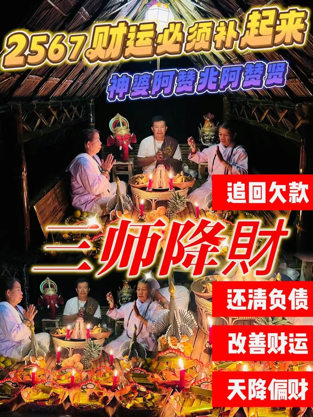 三师降財年底福利助力2024可以加上助力你的追款,改善财运,还清负债增加正財,偏财,三位师傅共同加持!效果直接3倍❗️❗️❗️神婆阿赞贤,阿赞兆,共同加持助力!只为2024,幸运的你泰北纳兰古法招财!全部都要最原始的方法!加持,来真正做到,顾客有效果所有法事师傅3对1完成✅,而且视频很详细!只有最详...